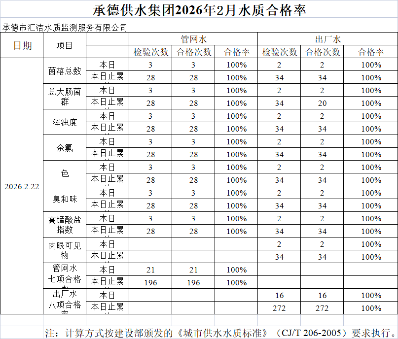 承德供水集團2026年2月22日水質合格率